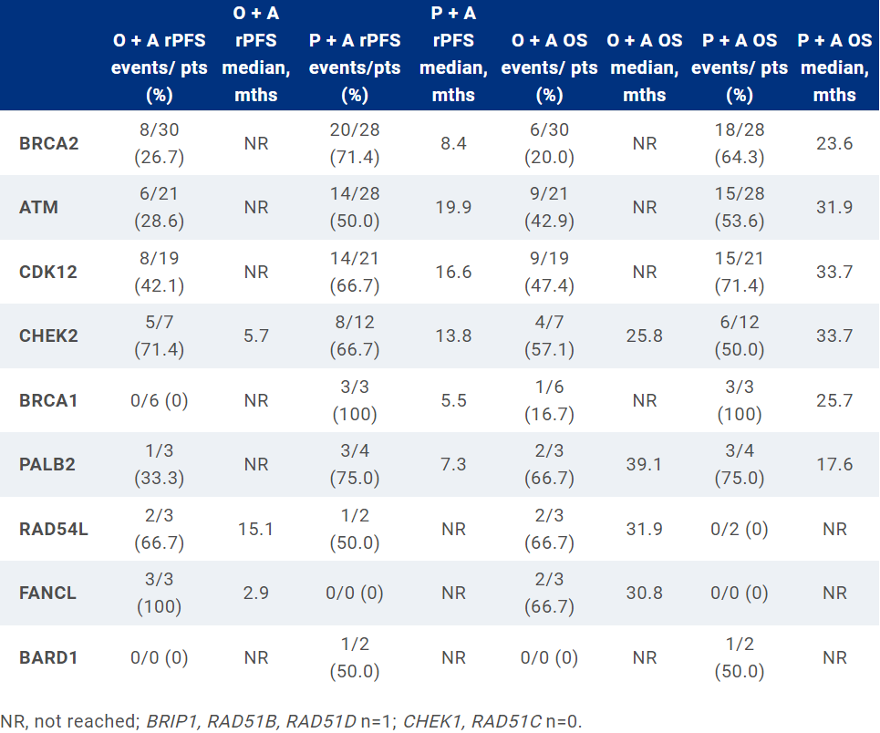 28.4%的患者携带HRRm。对于大多数单基因HRRm患者,与P+A组相比,O+A组的rPFS事件和死亡比例较低。最常见的基因突变是BRCA2、ATM和CDK12;rPFS和OS的HR在数值上更倾向于O+A组(rPFS:BRCA2,HR 0.20;ATM,HR 0.55;CDK12,HR 0.51.OS:BRCA2,HR 0.20;ATM,HR 0.79;CDK12,HR 0.57)。