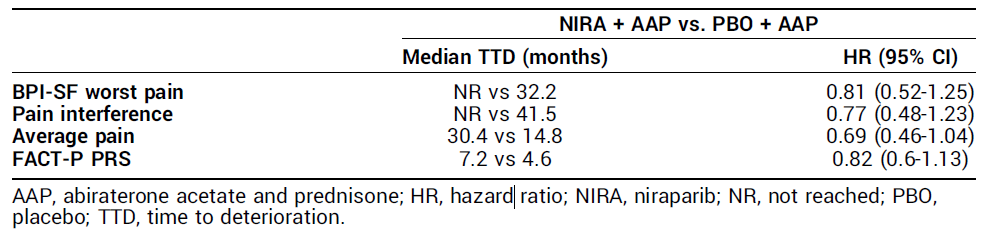 前瞻性筛选出存在同源重组修复(HRR)基因改变的患者。符合条件的患者具有ECOG评分≤1和简明疼痛量表–简表(BPI-SF)最严重疼痛评分≤3分,并按1:1的比例随机分配到每天口服NIRA+AAP组或PBO+AAP组,28天为一个周期。在特定周期的第1天进行PRO评估,包括BPI-SF和前列腺肿瘤治疗功能评估量表(FACT-P)。疼痛恶化的时间(TTD)在治疗组之间使用比例风险回归模型进行比较。HRQoL相对于基线的变化使用重复测量分析进行比较,FACT-P作为单一项评估两组的副作用困扰。