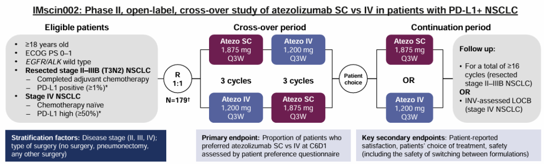 IMscin002试验纳入已完成辅助化疗、PD-L1≥1的肿瘤已切除II–IIIB(T3N2)NSCLC成人患者,以及未接受过化疗、PD-L1高表达的IV期NSCLC成人患者,要求ECOG PS评分为0-1,EGFR/ALK野生型。IMscin002将患者1:1随机分配接受阿替利珠单抗皮下给药或静脉给药,各3个周期。主要研究终点为患者偏好皮下给药的比例(C6D1);次要终点为患者报告的满意度、患者在延续治疗阶段选择的治疗方式以及安全性。