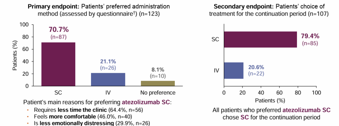 总体而言,患者偏好首选皮下给药,而不是静脉给药(分别为70.7%vs 21.1%),并且对皮下给药感到满意。IMscin002试验达到了主要终点:患者首选阿替利珠单抗皮下注射,而非静脉给药。