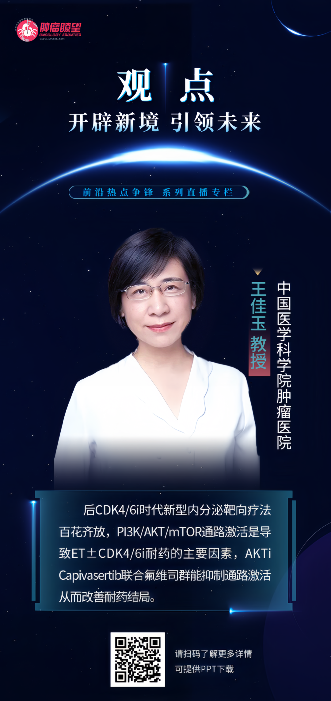 王佳玉教授总结指出:“后CDK4/6i时代新型内分泌靶向疗法百花齐放,PI3K/AKT/mTOR通路激活是导致ET±CDK4/6i耐药的主要因素,AKTi Capivasertib联合氟维司群能抑制通路激活从而改善耐药结局。”