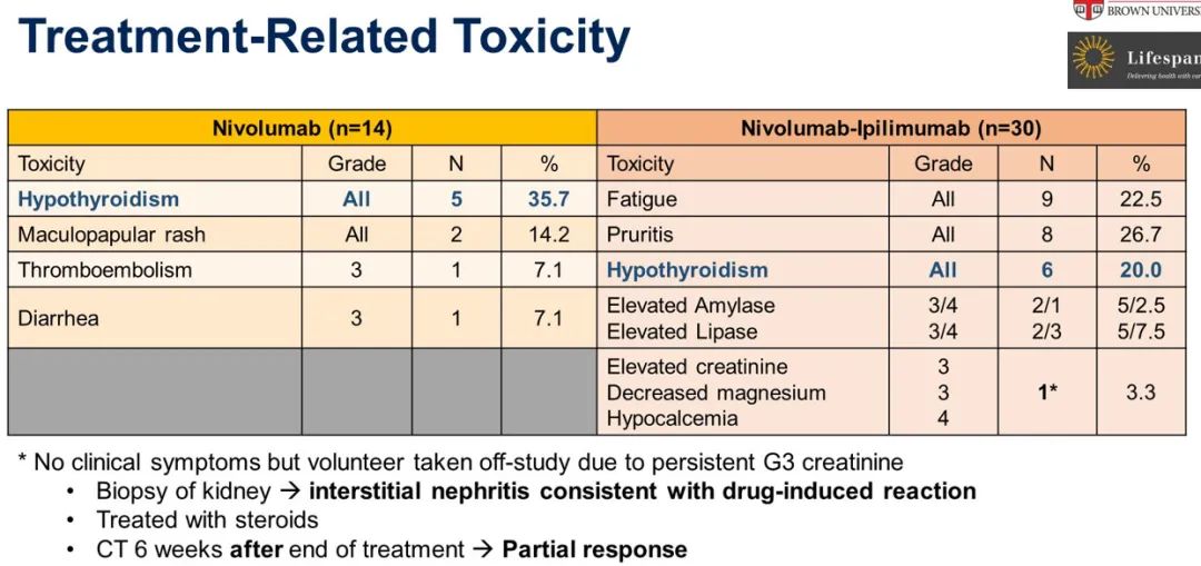 在接受免疫疗法治疗的妇科透明细胞癌患者中,没有发现新的安全信号。在免疫联合组中,任意级别的不良反应(AE)主要包括疲劳(22.5%)、瘙痒(26.7%)和甲状腺功能减退(20.0%)。在单药治疗组中,任意级别AE包括甲状腺功能减退(35.7%)、斑丘疹(14.2%)、血栓栓塞(7.1%)和腹泻(7.1)。一名患者因3级肌酐升高而退出研究。进行了肾脏活检,发现间质性肾炎,与药物治疗反应一致。患者接受了类固醇治疗,治疗6周后CT扫描显示PR。