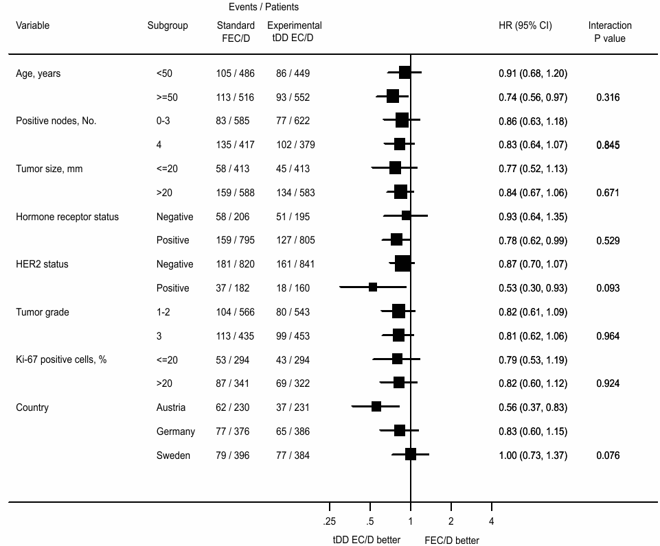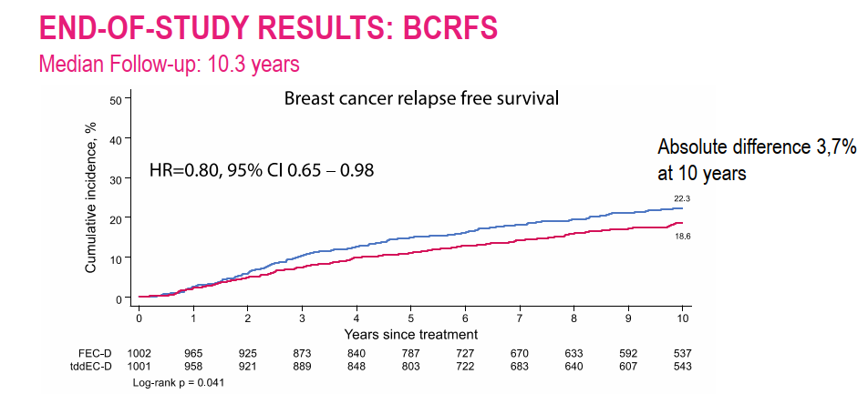 今年ESMO BC大会上,报道了III期临床研究PANTHER随访十年的疗效及关键亚组的结果。在2007年2月至2011年9月期间,2003名患者随机分为两组。一组为实验组:定制剂量密集型辅助化疗(简称为tDD EC/D),一组为对照组:标准间隔化疗。在中位随访10.3年后,实验组有179例乳腺癌复发,对照组有218例复发。tDD EC/D治疗改善了BCRFS(乳腺癌无复发存活期)的主要终点(HR=0.80,95%CI:0.65~0.98,P=0.030;10年事件率为18.6%vs.22.3%,绝对差异3.7%±1.9%)。根据激素受体和HER2表达、解剖分期以及其他人口统计学和病理因素,BCRFS在各个亚组中均有改善,亚组分析中观察到年龄>50岁/激素受体阳性/HER2阳性接受曲妥治疗的患者获益明显。两组总生存期的差异无统计学意义(HR=0.82,95%CI:0.65~1.04,P=0.109;10年事件率15.1%vs.16.6%,绝对差1.5%±1.7%)。结论认为,在PANTHER试验10年随访的数据显示,与含有每三周一次多西他赛的标准辅助化疗相比,定制剂量密集型辅助化疗改善了BCRFS。