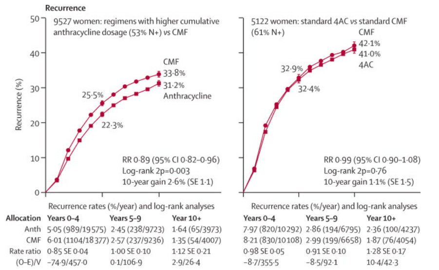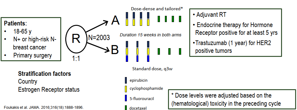 剂量密集疗法指在不增加累积剂量的情况下,以较短的时间间隔进行化疗,被认为是一种可以提高治疗疗效的方法。2003年在JCO上发表的CALGB9741研究中提示对于淋巴结阳性患者,剂量密集型的2周化疗方案相对于3周化疗方案可降低26%的复发风险[2]。类似的研究结果也在一项META分析中得到证实[3]