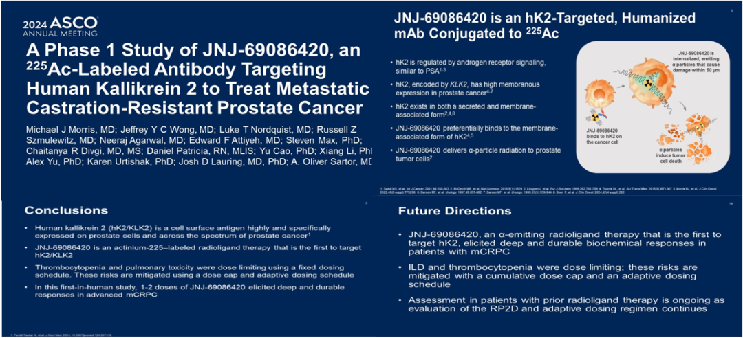 ASCO年会上也公布了多种新型靶点的探索性研究。其中JNJ-6420是一种首创靶向hK2(由KLK2基因编码)的放射性配体疗法,可将高能量短程α粒子发射体225Ac输送至表达hK2的前列腺癌细胞。这项研究的结果表明,对于既往接受过≥1种的雄激素受体通路抑制剂治疗的患者,JNJ-6420治疗可使mCRPC住院患者出现深度且持久的缓解,但过半患者经历了≥3级的治疗相关不良事件。而双抗ADC可以更进行更精准的治疗,有望避免部分毒副作用,值得未来进一步探索。