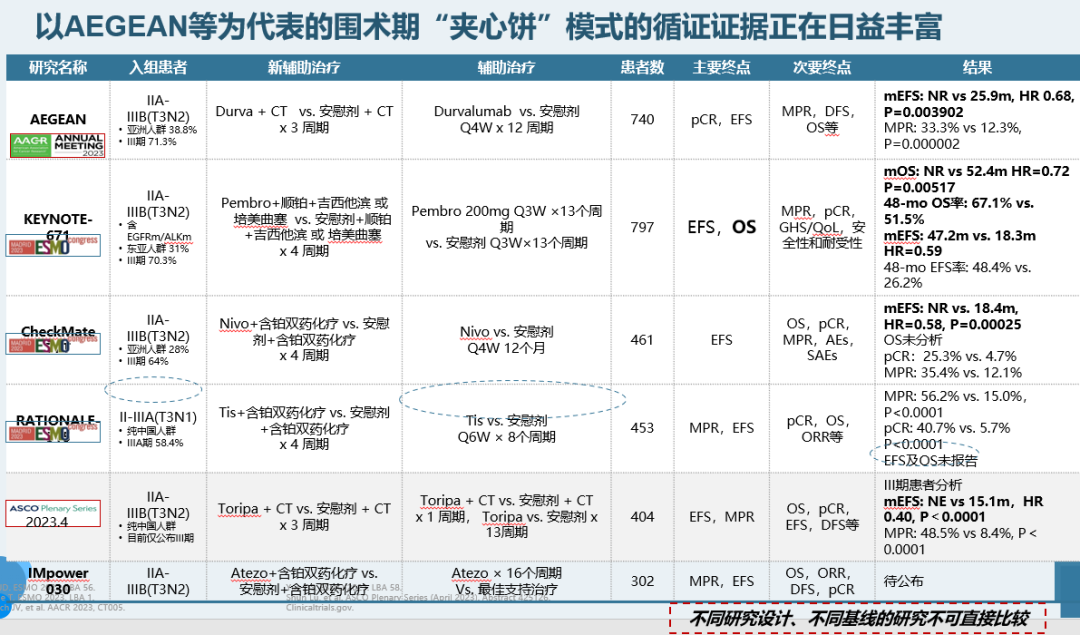 以免疫治疗介入时机为出发点的围手术期治疗模式探索正在进行。AEGEAN是全球首个报道阳性结果的肺癌免疫“夹心饼式”围术期治疗的III期研究,取得完全病理缓解(pCR)、主要病理缓解(MPR)、无事件生存(EFS)三重获益,安全性可控。目前,围术期“夹心饼”模式的循证证据正在日益丰富。然而,围术期免疫治疗面临着一些新问题,以下介绍其中备受关注的四个议题。