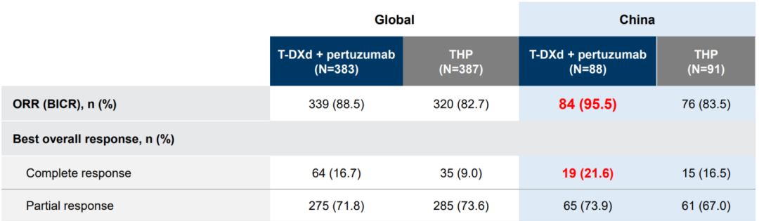首先,在未来的HER2阳性乳腺癌初始一线治疗方面,有了如此强大的治疗方案,将使很多患者第一时间获得缓解。该研究中T-DXd+P方案的全球人群总体客观缓解率(ORR)为88.5%多,中国人群ORR高达95.5%,意味着未来对于此类患者使用该方案时,我们有信心在初始治疗时对患者说有九成把握使肿瘤退缩。同时,中国人群完全缓解率(CR)能达到21.6%,即有1/5的患者经过治疗以后可以使病灶完全消失[1,2]