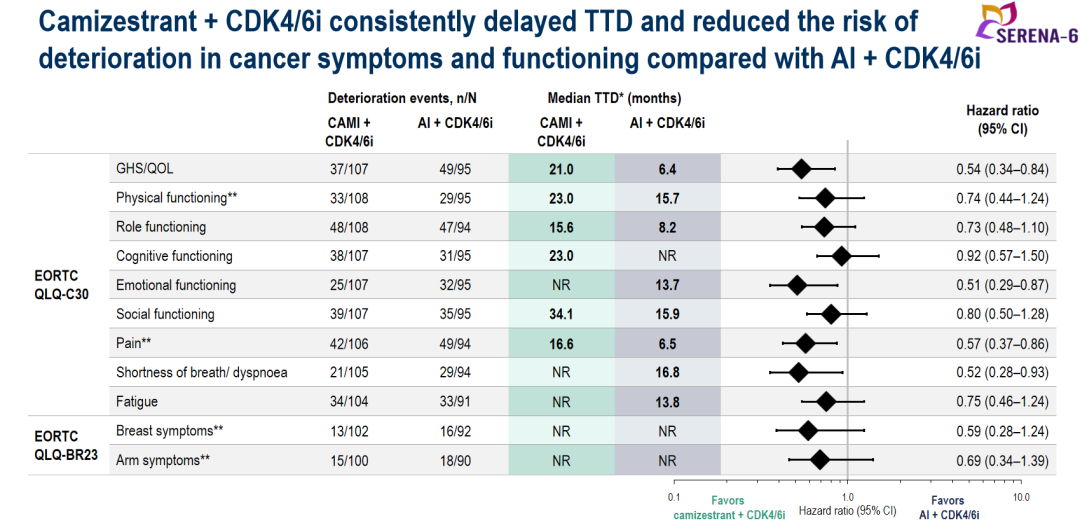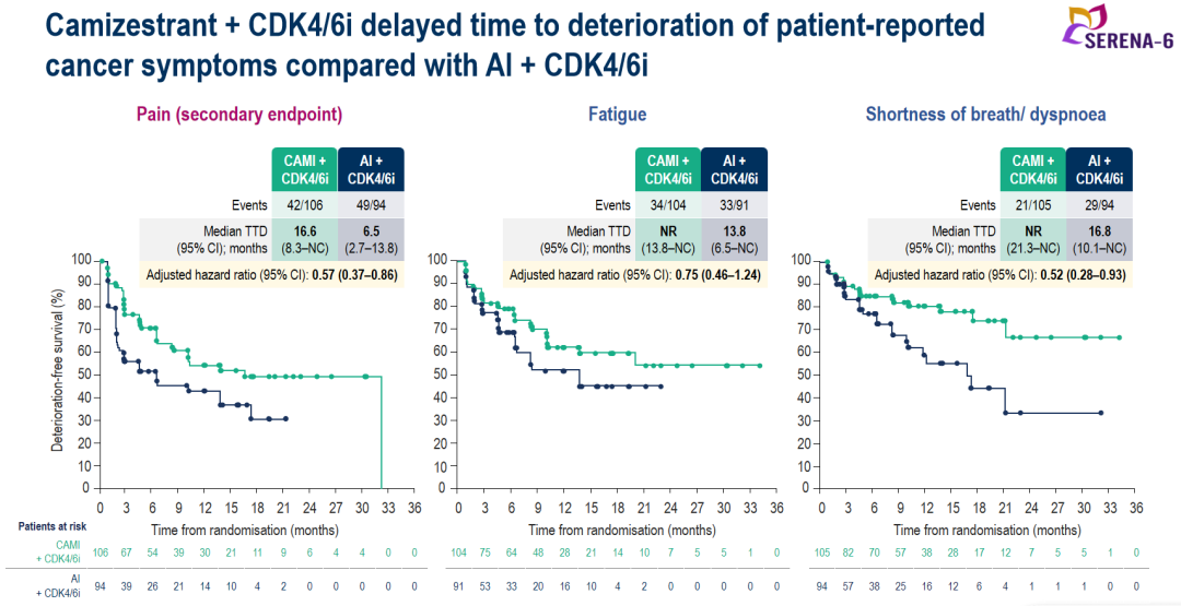 中位至疾病恶化时间(TTD)分析显示,Camizestrant+CDK4/6i改善了整体生活质量(GHS/QoL),延迟了疼痛、恶心、气短等症状TTD。此外,患者身体功能、角色功能、乳房症状和手臂症状的恶化风险下降。